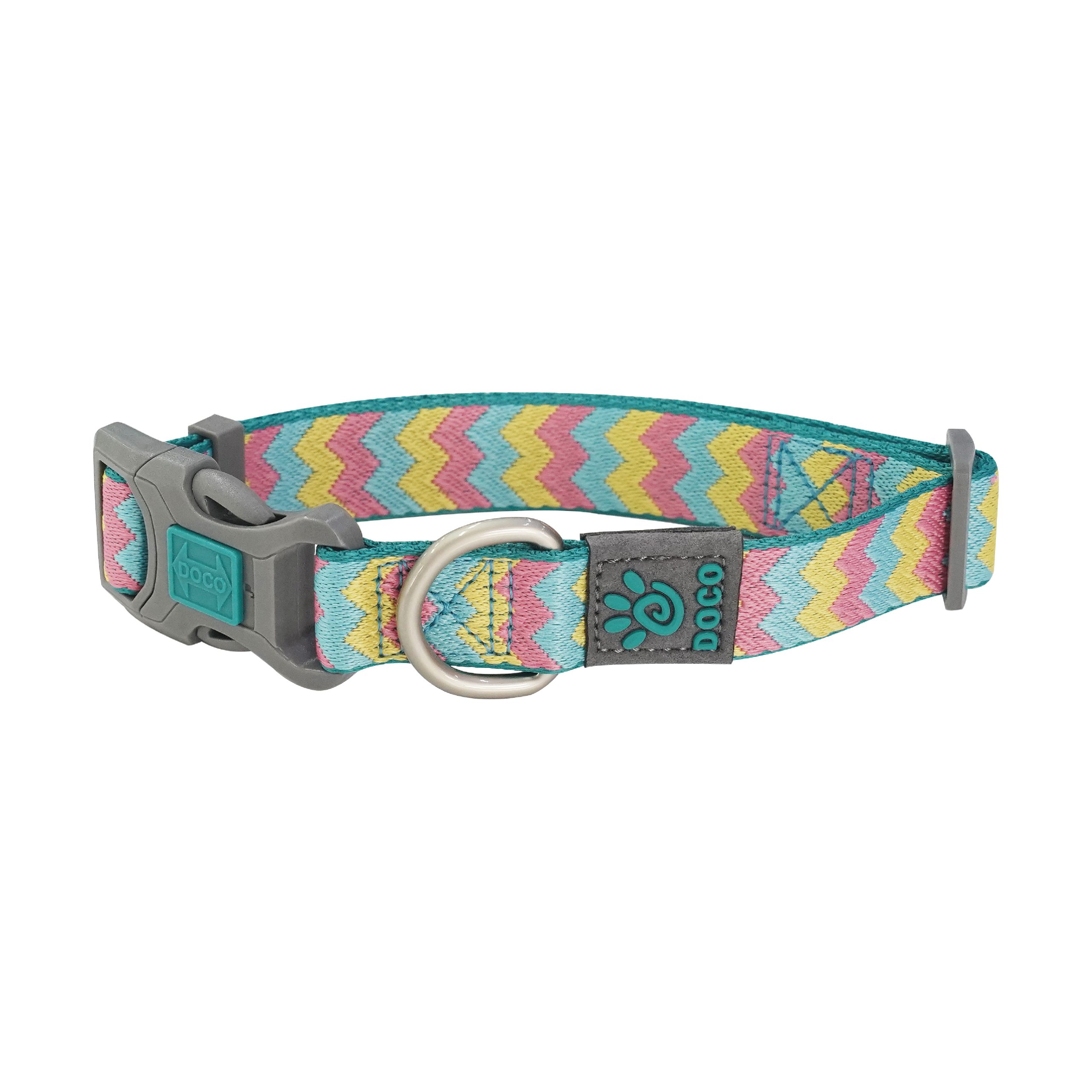 DOCO Jacquard weave collar features soft, patented metal and plastic fit buckle for added security, and adjustable tri-glide for custom fits. Heavy duty stitching for lasting quality and metal D-ring for attaching identification tag and leash. Make sure to select the matching leash to complete your buddies look!